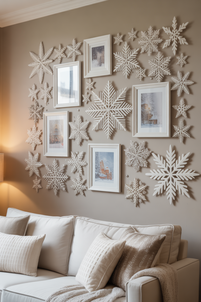 Turn a blank living room wall into a winter masterpiece with snowflake wall art. Hang a mix of paper, wood, or metal snowflakes in different sizes to create a gallery wall effect. Add a few framed holiday quotes or prints for variety. Keep the color scheme simple—white, silver, or gold—for a clean, elegant look.
