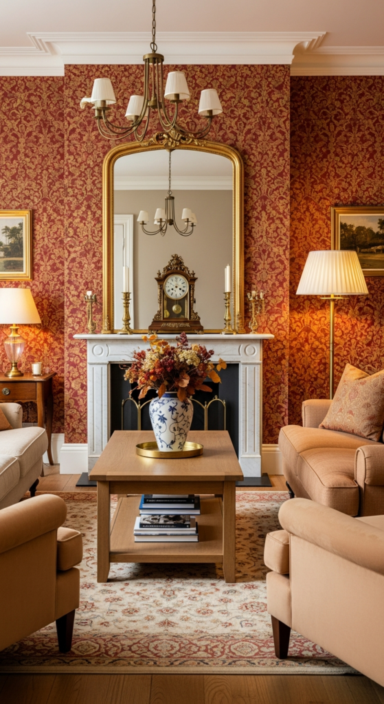 Balancing strong wallpaper colors with neutral furniture is essential. Cream, beige, or soft gray upholstery allows the wallpaper to shine without overpowering the room. Metallic accents in brass or bronze enhance the warmth and add a touch of sophistication. This idea works particularly well in living rooms that receive plenty of natural light, as the warm tones glow beautifully during the day.