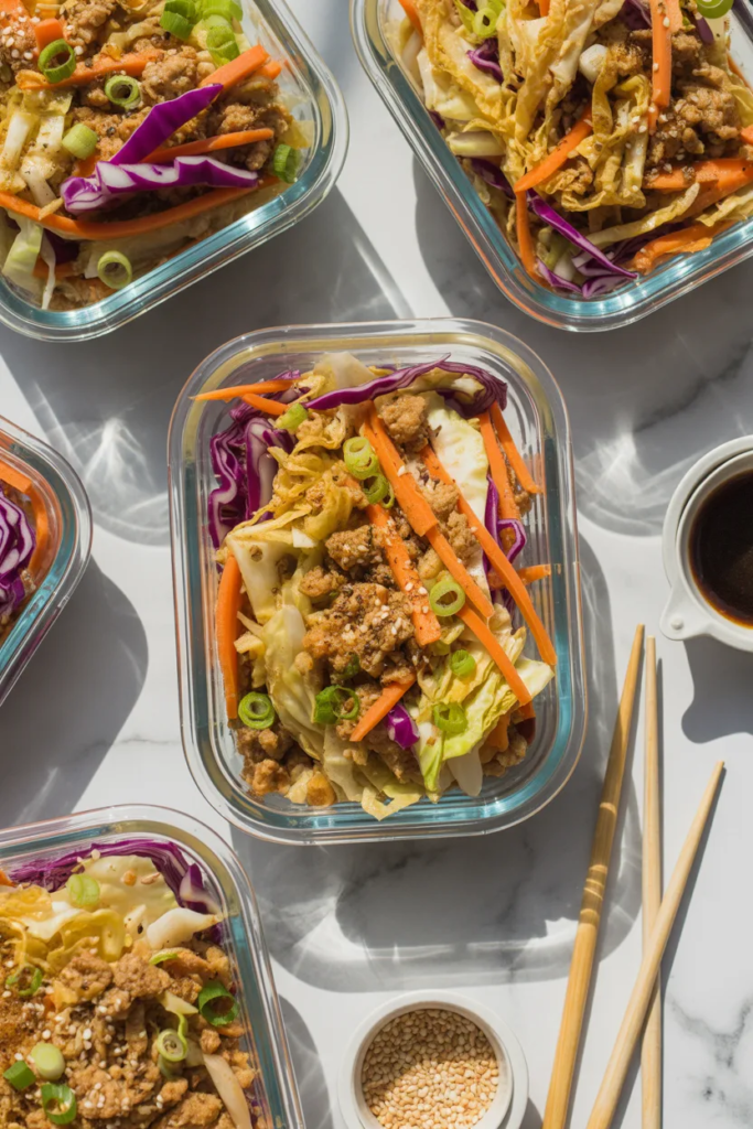 Egg roll in a bowl simplifies flavors into efficient Meal Prep Lunch Ideas. Ground protein and shredded vegetables cook quickly and store well. This dish offers bold flavor without heaviness.