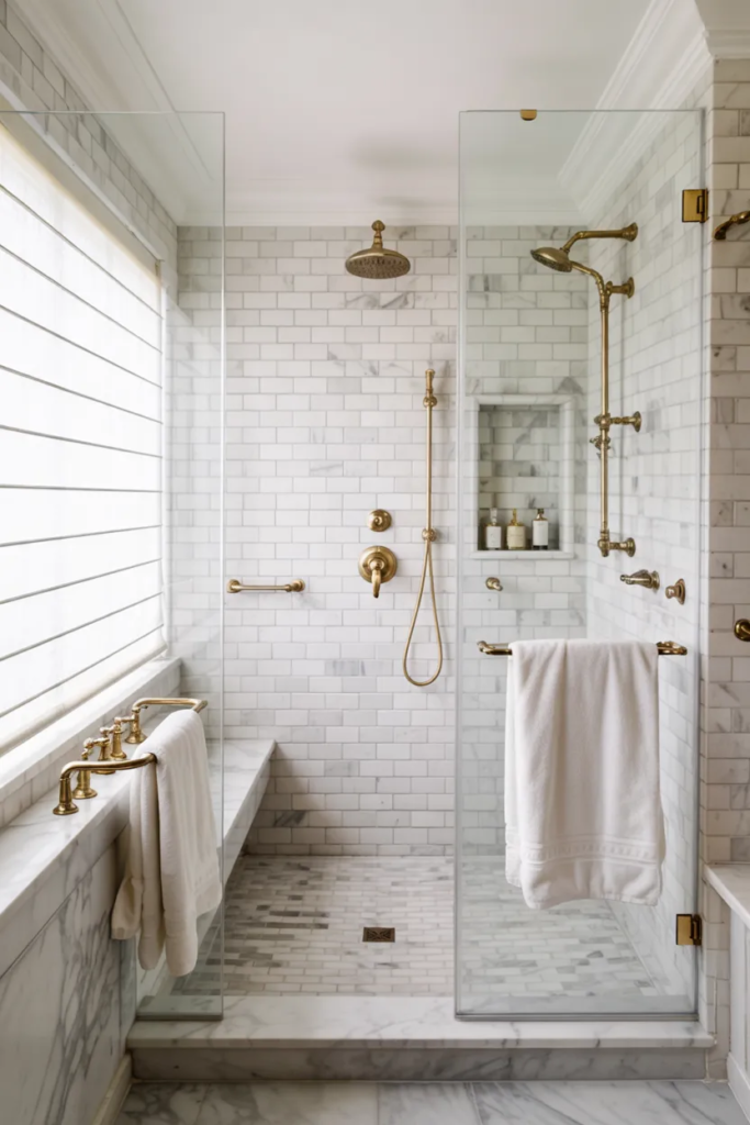 Warm metallic fixtures elevate the shower’s elegance instantly. Gold or brushed brass finishes add richness.